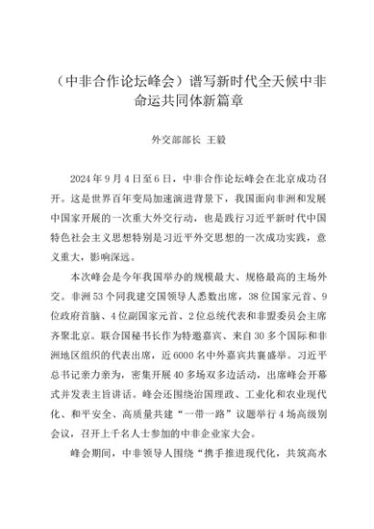 / 署名文章:20240910(中非合作论坛峰会)谱写新时代全天候中非命运共同体新篇章——外交部部长 王毅