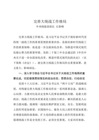 署名文章:20240831(学习贯彻三中全会精神)完善大统战工作格局——中央统战部部长 石泰峰