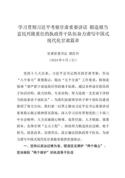 / 署名文章:20240901学习贯彻习近平考察甘肃重要讲话 锻造堪当富民兴陇重任的执政骨干队伍——甘肃省委书记 胡昌升