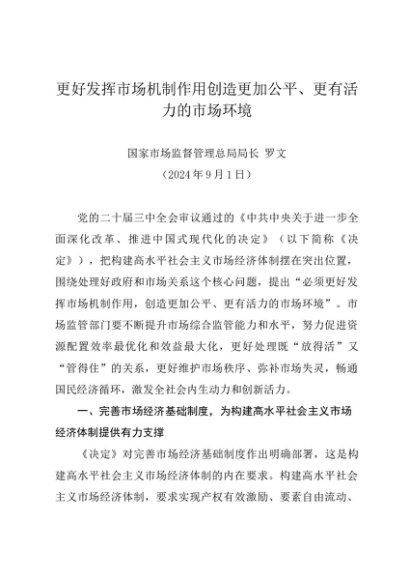 署名文章:20240901更好发挥市场机制作用创造更加公平、更有活力的市场环境——国家市场监督管理总局局长 罗文
