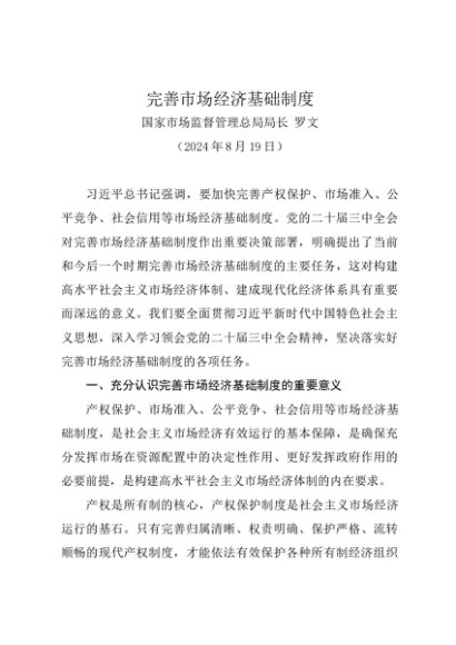 / 署名文章:20240819(学习贯彻三中全会精神)完善市场经济基础制度——国家市场监督管理总局局长 罗文