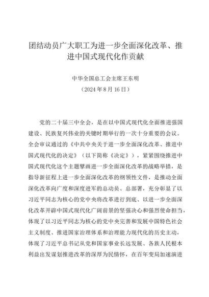 署名文章:20240816(学习贯彻三中全会精神)团结动员广大职工为进一步全面深化改革、推进中国式现代化作贡献——中华全国总工会主席王东明