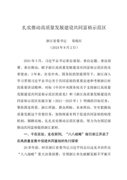 署名文章:20240802扎实推动高质量发展建设共同富裕示范区——浙江省委书记 易炼红