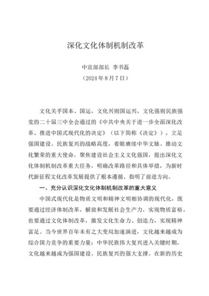 署名文章:20240807(学习贯彻三中全会精神)深化文化体制机制改革——中宣部部长 李书磊