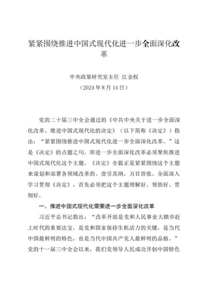 署名文章:20240814(学习贯彻三中全会精神)紧紧围绕推进中国式现代化进一步全面深化改革——中央政策研究室主任 江金权