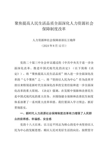 署名文章:20240812(学习贯彻三中全会精神)聚焦提高人民生活品质全面深化人力资源社会保障制度改革——人力资源和社会保障部部长王晓萍