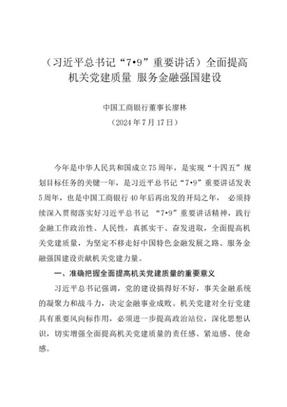 署名文章:20240717(习近平总书记“7•9”重要讲话)全面提高机关党建质量 服务金融强国建设——中国工商银行董事长廖林