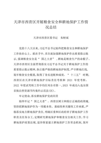 / 署名文章:20240720天津市西青区开展粮食安全和耕地保护工作情况总结——区委书记 朱财斌