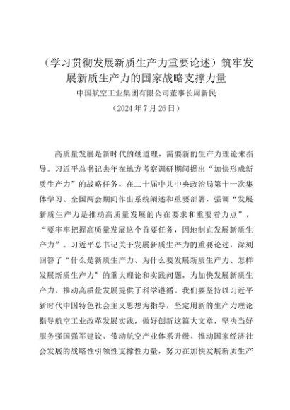 署名文章:20240726(学习贯彻发展新质生产力重要论述)筑牢发展新质生产力的国家战略支撑力量——中国航空工业集团有限公司董事长周新民