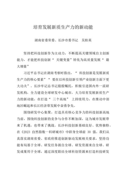 署名文章:20240531培育发展新质生产力的新动能——湖南省委常委、长沙市委书记 吴桂英