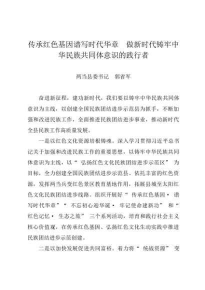 署名文章:20240527传承红色基因谱写时代华章 做新时代铸牢中华民族共同体意识的践行者——两当县委书记