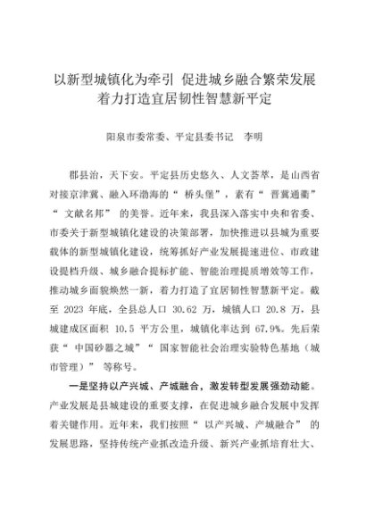 署名文章:20240519以新型城镇化为牵引 促进城乡融合繁荣发展 着力打造宜居韧性智慧新平定——阳泉市委常委、平定县委书记 李明