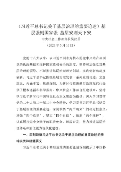 署名文章:20240516(习近平总书记关于基层治理的重要论述)基层强则国家强 基层安则天下安——中央社会工作部部长吴汉圣