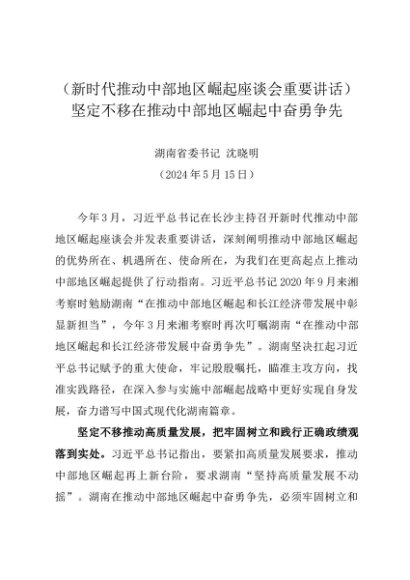 署名文章:20240515(新时代推动中部地区崛起座谈会重要讲话)坚定不移在推动中部地区崛起中奋勇争先——湖南省委书记 沈晓明