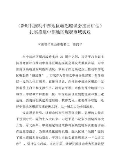/ 署名文章:20240508(新时代推动中部地区崛起座谈会重要讲话)扎实推进中部地区崛起市域实践——河南省平顶山市委书记