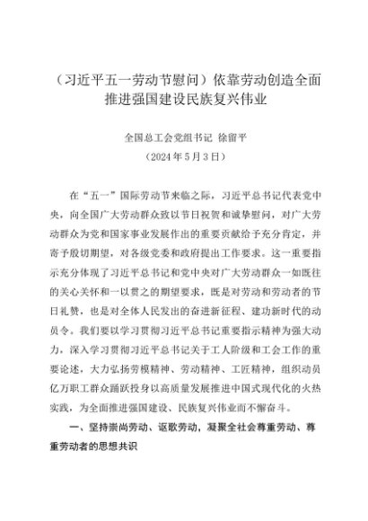 署名文章:20240503(习近平五一劳动节慰问)依靠劳动创造全面推进强国建设民族复兴伟业——全国总工会党组书记 徐留平