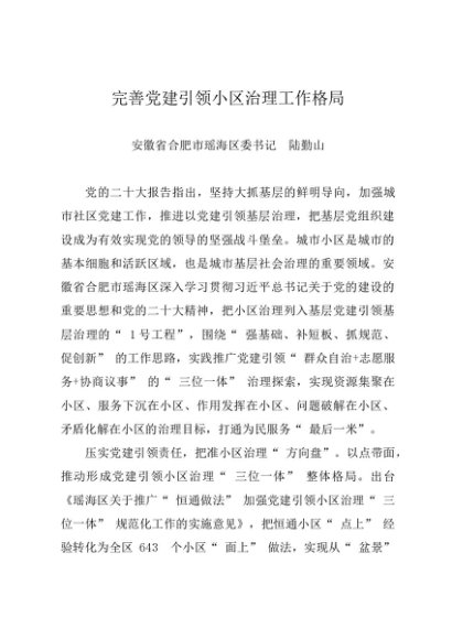 署名文章:20240508完善党建引领小区治理工作格局——安徽省合肥市瑶海区委书记