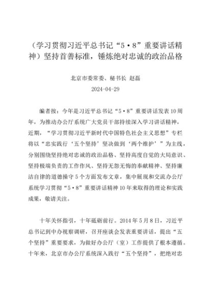 署名文章:20240429(学习贯彻习近平总书记“5·8”重要讲话精神)坚持首善标准,锤炼绝对忠诚的政治品格——北京市委秘书长 赵磊