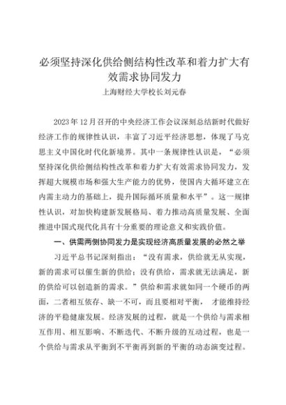 / 署名文章:20240430必须坚持深化供给侧结构性改革和着力扩大有效需求协同发力——上海财经大学校长刘元春