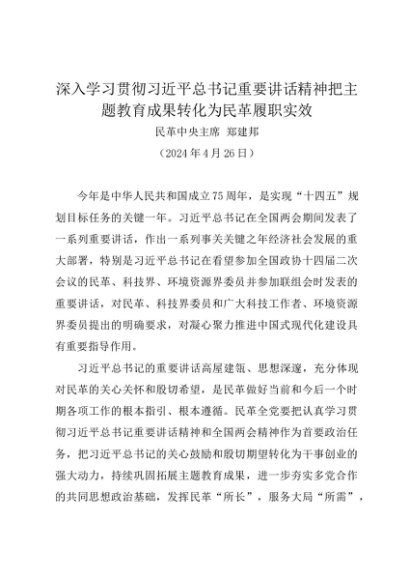 署名文章:20240426深入学习贯彻习近平总书记重要讲话精神把主题教育成果转化为民革履职实效——民革中央主席 郑建邦
