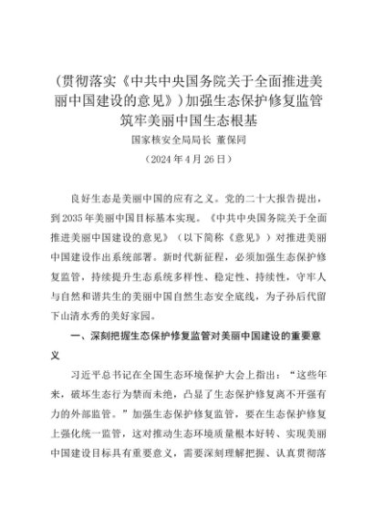 署名文章:20240426(贯彻落实《中共中央国务院关于全面推进美丽中国建设的意见》)加强生态保护修复监管筑牢美丽中国生态根基——国家核安全局局长 董保同