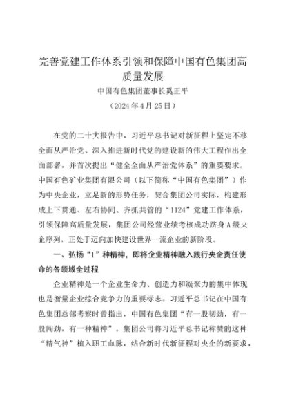署名文章:20240426完善党建工作体系引领和保障中国有色集团高质量发展——中国有色集团董事长奚正平