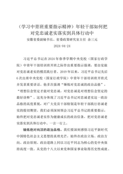 署名文章:20240424(学习中青班重要指示精神)年轻干部如何把对党忠诚老实落实到具体行动中——安徽省委副秘书长、省委政策研究室主任 余三元