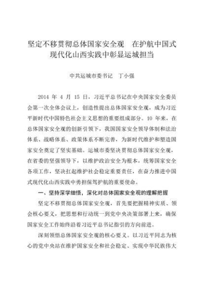 署名文章:20240417坚定不移贯彻总体国家安全观 在护航中国式现代化山西实践中彰显运城担当——中共运城市委书记 丁小强