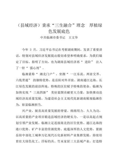 / 署名文章:20240416(县域经济)秉承“三生融合”理念 厚植绿色发展底色——中共临湘市委书记 王文华