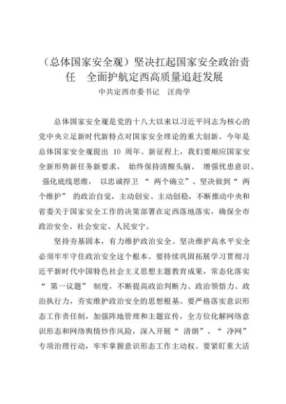 署名文章:20240415(总体国家安全观)坚决扛起国家安全政治责任 全面护航定西高质量追赶发展——中共定西市委书记 汪尚学