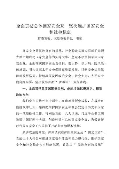 / 署名文章:20240415全面贯彻总体国家安全观 坚决维护国家安全和社会稳定——省委常委、太原市委书记 韦韬