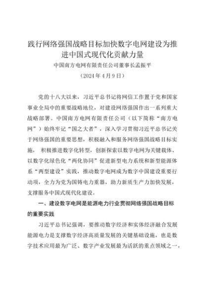 署名文章:20240409践行网络强国战略目标加快数字电网建设为推进中国式现代化贡献力量——中国南方电网有限责任公司董事长孟振平