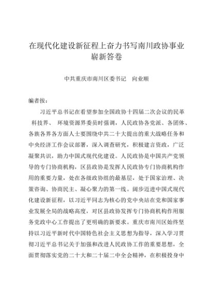 / 署名文章:20240329(政协工作)在现代化建设新征程上奋力书写南川政协事业崭新答卷——重庆市南川区委书记 向业顺
