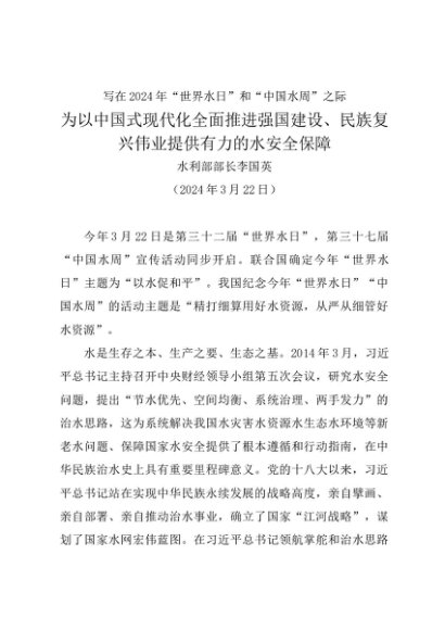 署名文章:20240322(“世界水日”和“中国水周”)为以中国式现代化全面推进强国建设、民族复兴伟业提供有力的水安全保障——水利部部长李国英