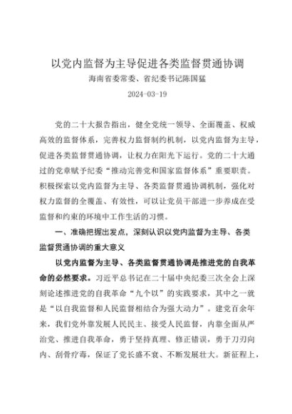 / 署名文章:20240319(党内监督)以党内监督为主导促进各类监督贯通协调——海南省纪委书记陈国猛
