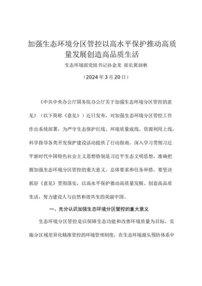 署名文章:20240320加强生态环境分区管控以高水平保护推动高质量发展创造高品质生活——生态环境部党组书记孙金龙 部长黄润秋