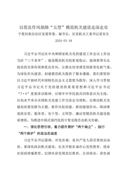 / 署名文章:20240318(机关党建)以优良作风保障“五型”模范机关建设走深走实——宁夏区委秘书长雷东生