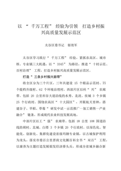 署名文章:20240314(千万工程 乡村振兴)以千万工程经验为引领 打造乡村振兴高质量发展示范区——太谷区委书记 郁效军