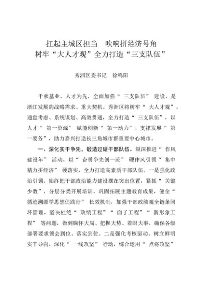署名文章:20240314(人才建设)扛起主城区担当 吹响拼经济号角 树牢“大人才观”全力打造“三支队伍”——秀洲区委书记 徐鸣阳