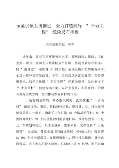 / 署名文章:20240318(千万工程)示范引领系统推进 全力打造践行“ 千万工程”经验灵石样板——灵石县委书记 韩军