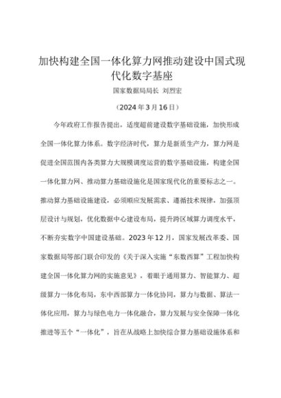 署名文章:20240316加快构建全国一体化算力网推动建设中国式现代化数字基座——国家数据局局长 刘烈宏
