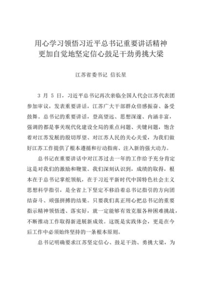 署名文章:20240309(两会专刊)用心学习领悟习近平总书记重要讲话精神 更加自觉地坚定信心鼓足干劲勇挑大梁——江苏省委书记 信长星