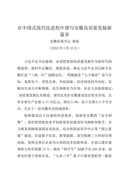 署名文章:20240310(两会专刊)在中国式现代化进程中谱写安徽高质量发展新篇章——安徽省委书记 韩俊