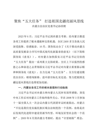 署名文章:20240306(考察内蒙古重要指示)聚焦“五大任务” 打造祖国北疆亮丽风景线——内蒙古自治区党委书记孙绍骋