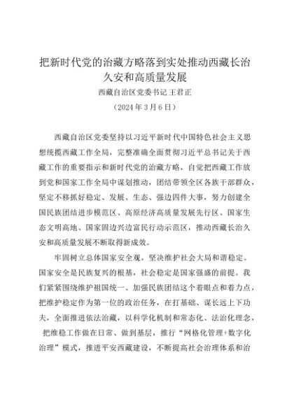 署名文章:20240306(两会专刊)把新时代党的治藏方略落到实处推动西藏长治久安和高质量发展——西藏自治区党委书记 王君正