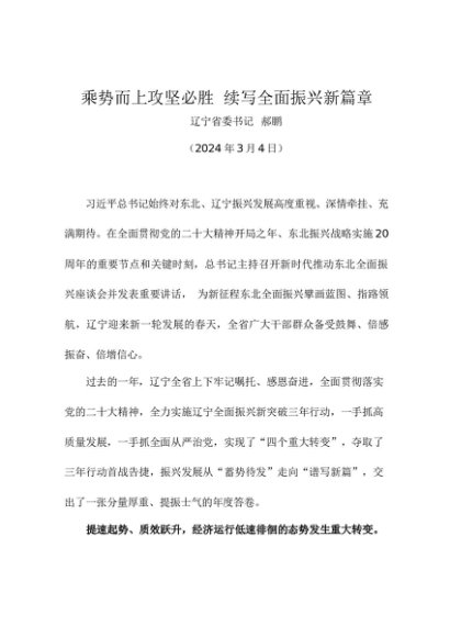 署名文章:20240304乘势而上攻坚必胜 续写全面振兴新篇章——辽宁省委书记 郝鹏