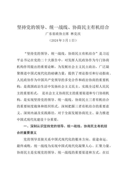 署名文章:20240301坚持党的领导、统一战线、协商民主有机结合——广东省政协主席 林克庆