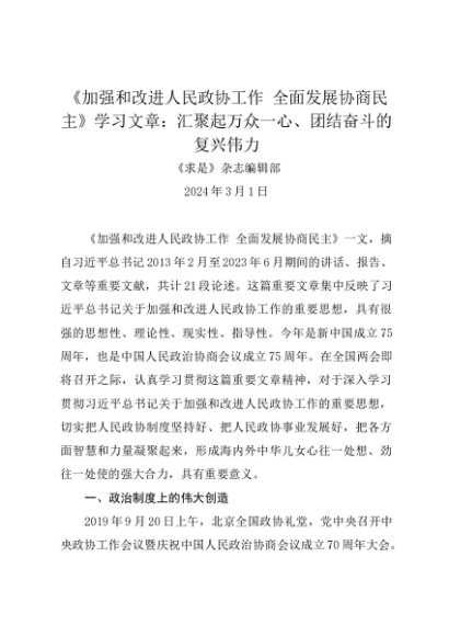 / 署名文章:20240301《加强和改进人民政协工作 全面发展协商民主》学习文章:汇聚起万众一心、团结奋斗的复兴伟力