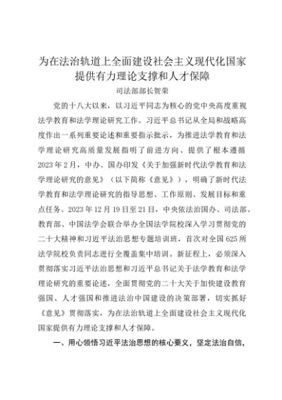 / 署名文章:20240130为在法治轨道上全面建设社会主义现代化国家提供有力理论支撑和人才保障——司法部部长贺荣