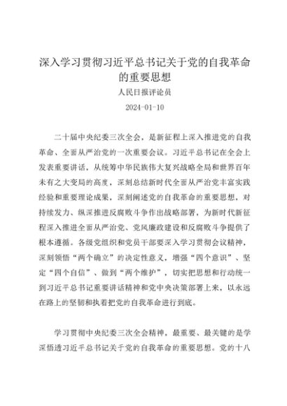 署名文章:20240110(党的自我革命重要思想)深入学习贯彻习近平总书记关于党的自我革命的重要思想——人民日报评论员